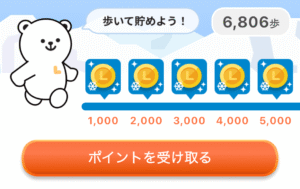 - 1日あたりの歩数:4,000歩(=1,000歩ごとに4回受け取り)