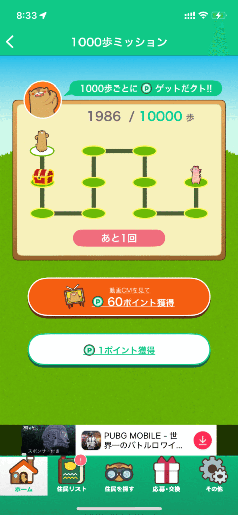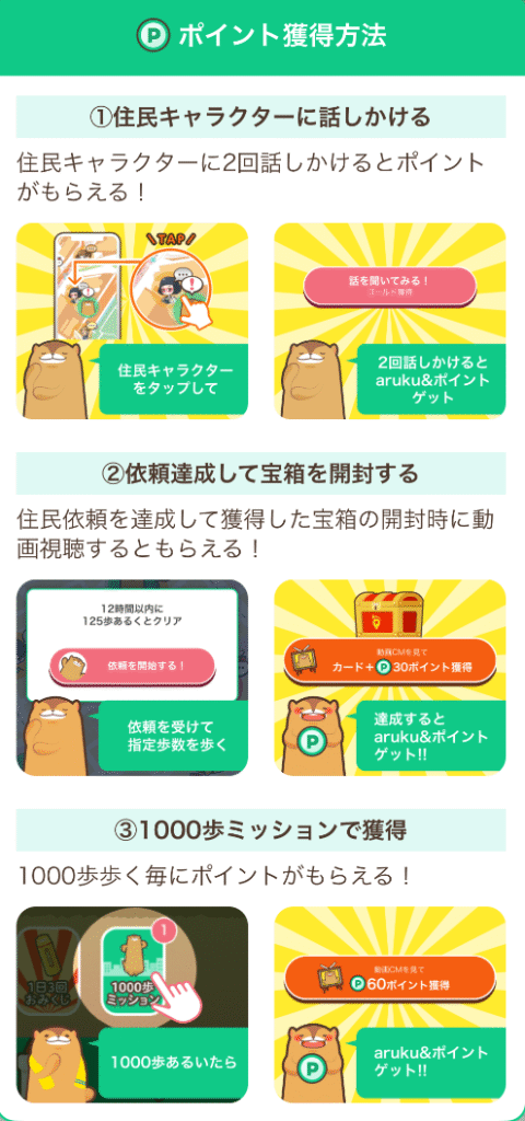 | 付与条件 | 1000歩ごと(1日10回まで)や依頼達成で入手。 動画視聴:60pt / 動画なし:1pt |