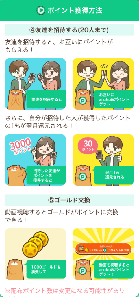- aruku&ポイントの受け取り:動画視聴あり=60pt/回